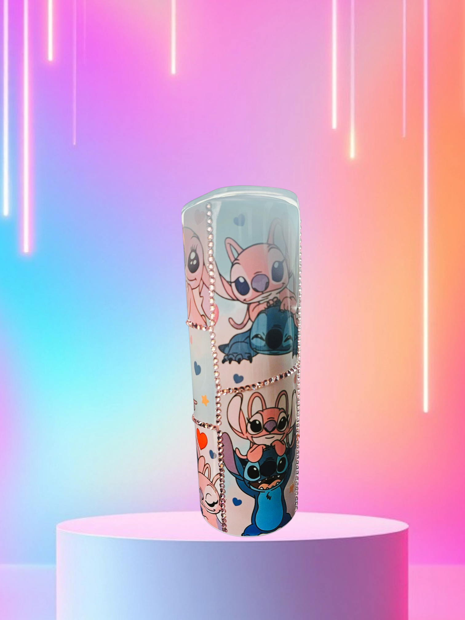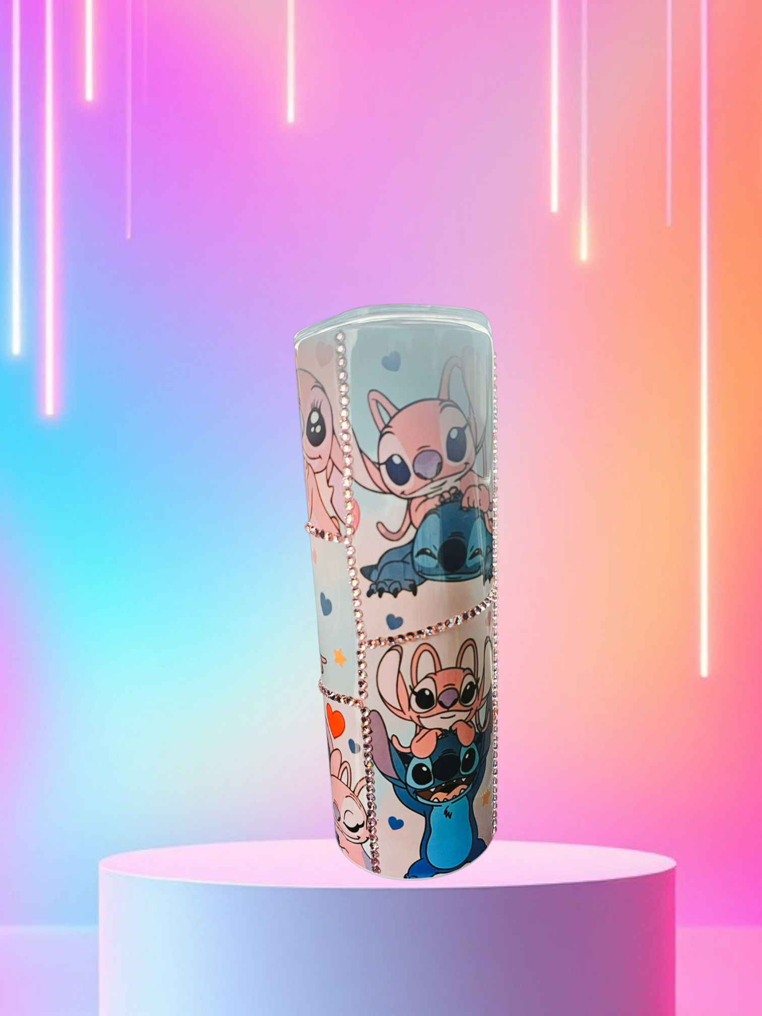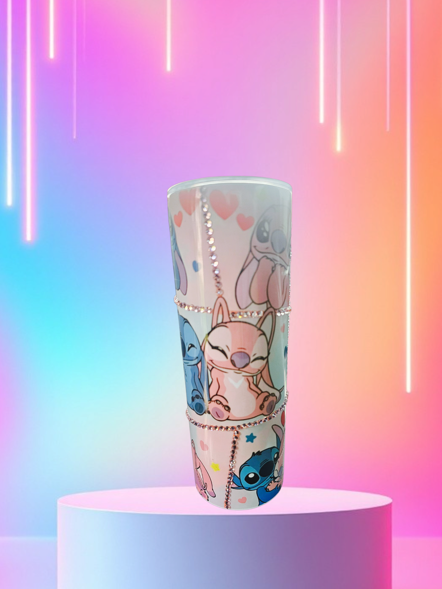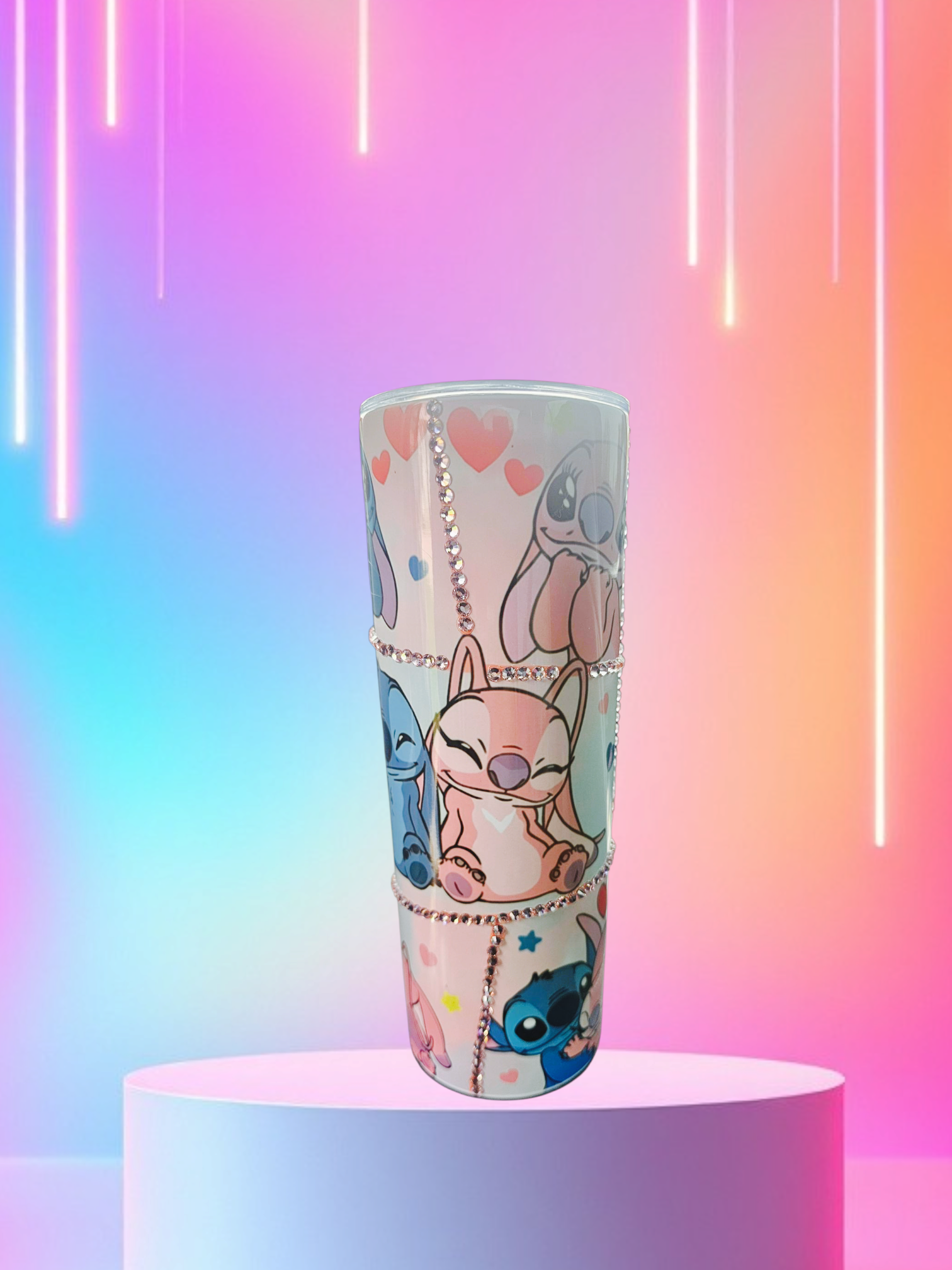 Check out this super cute Lilo and Stitch tumbler! It's adorned with rhinestones for a special touch. Plus, it holds 20 oz and comes with a straw included. Perfect for your favorite drinks!